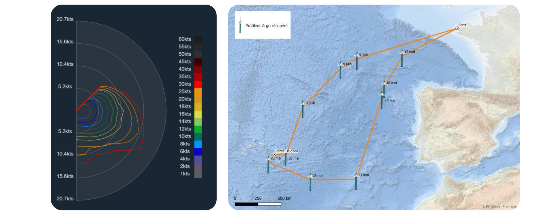 Through a massive statistical study covering 10 years of historical weather data and 684 simulated departures, we were able to estimate the optimal route to connect the 10 target floats. This analysis identified the ideal weather window and estimated the total duration of the campaign.